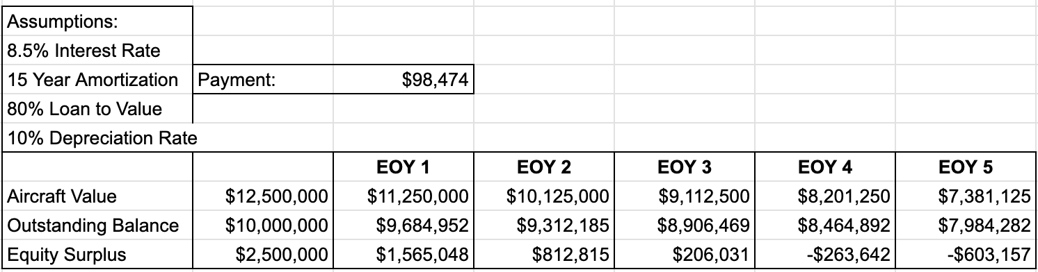 Uh oh, in order to make your higher payment of $98,474 you had to charter the aircraft 50 hours a month, which depreciated your aircraft at 10% instead of 5% per year, leaving you in a negative equity position after ~ Year 3. The bank is now incredibly exposed as its not backed by the asset anymore, so they shorten your amortization to 10 years.