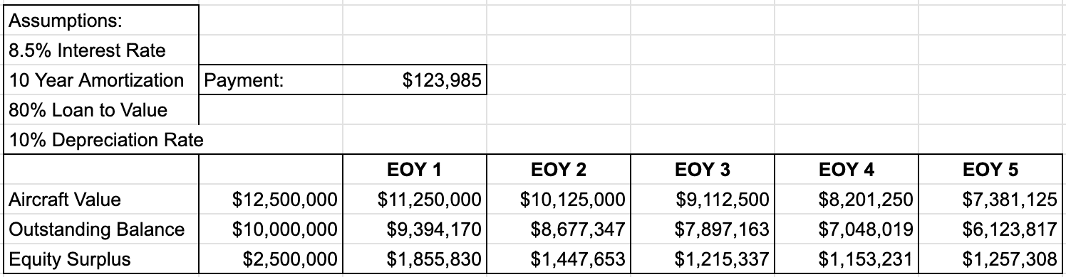 Below is an example of what we might see in a Part 91 scenario on our hypothetical $12,500,000 aircraft. This assumes a 5% depreciation rate, which is conservative. The payment comes out to $87,110 per month.