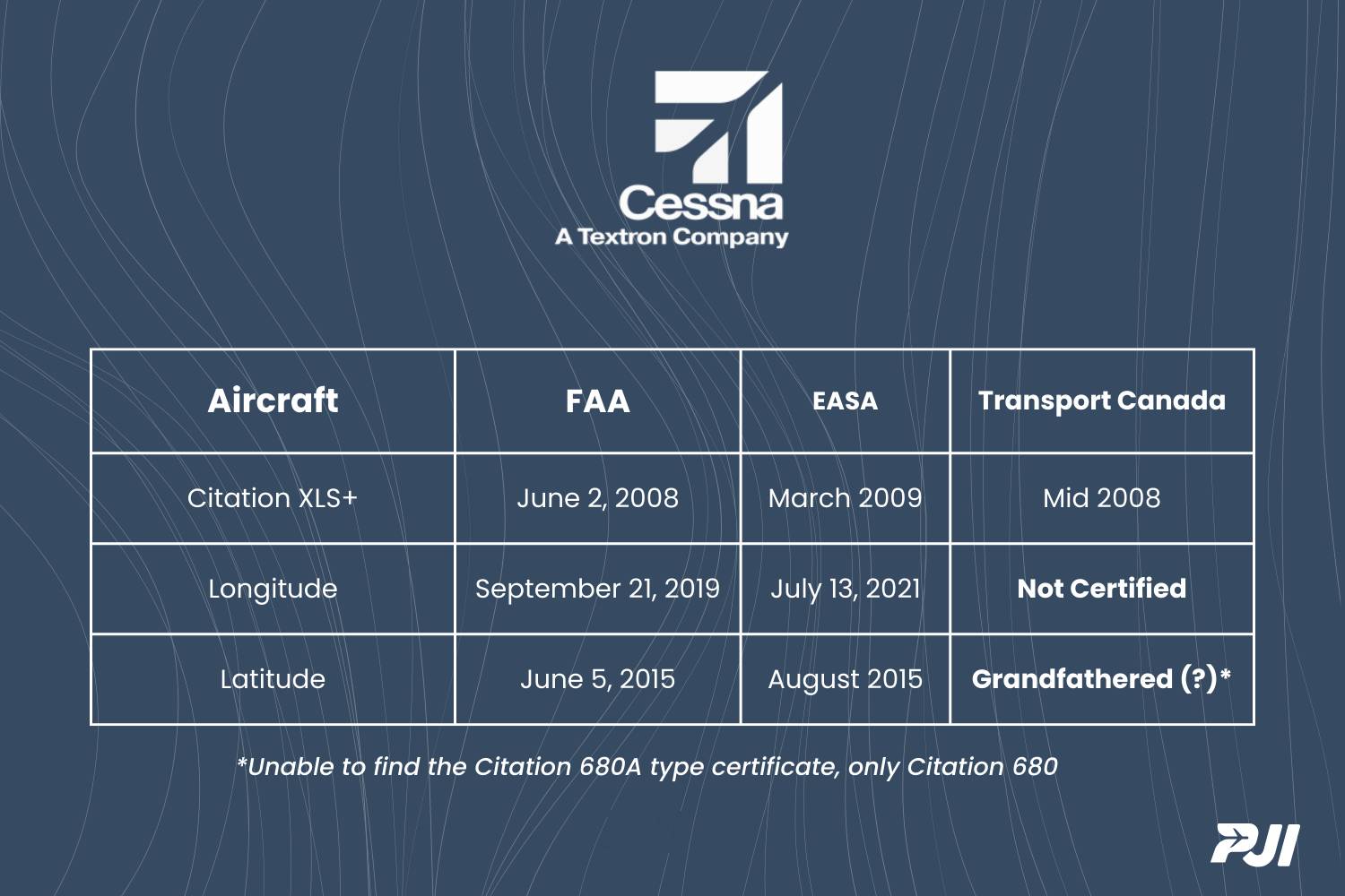 Here's a few from Textron. Textron has an interesting strategy in that they typically do modifications to their type certificates (See: What's Old is New), but in searching the Transport Canada Website I couldn't find the Longitude anywhere and I couldn't find the 680A specifically (may have been grandfathered in from the Citation 680).